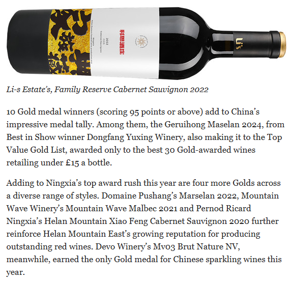Cabernet Sauvignon 2022, also from Ningxia. Ten more Chinese wines earned Gold medals,