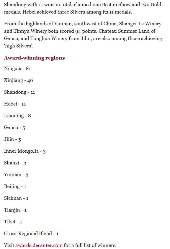 including the country’s only awarded sparkling wine. Ningxia emerged as the standout region,