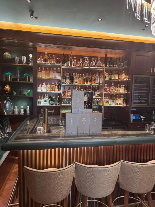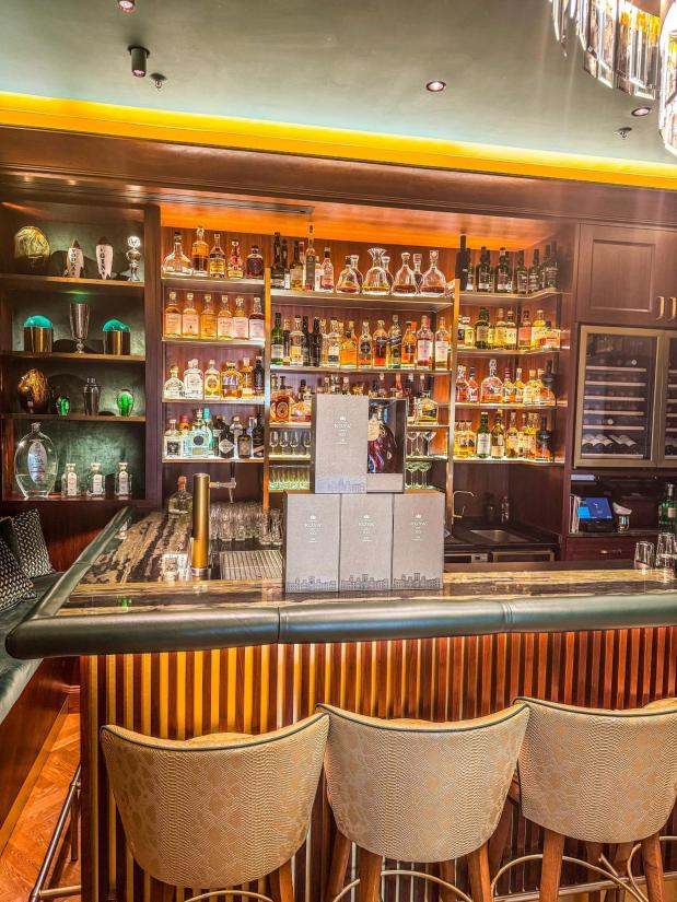 designed spaces such as a warm walnut-toned bar with olive-green accents, a tranquil library,